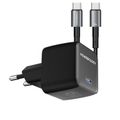 Powerology QX 45W Pocket-Sized GaN Adapter with Safety Protections, 1m USB-C to USB-C Cable Included, USB-C Port, Ultra-Compact Design, EU 2-Pin Plug, PD 45W - Black / Gray