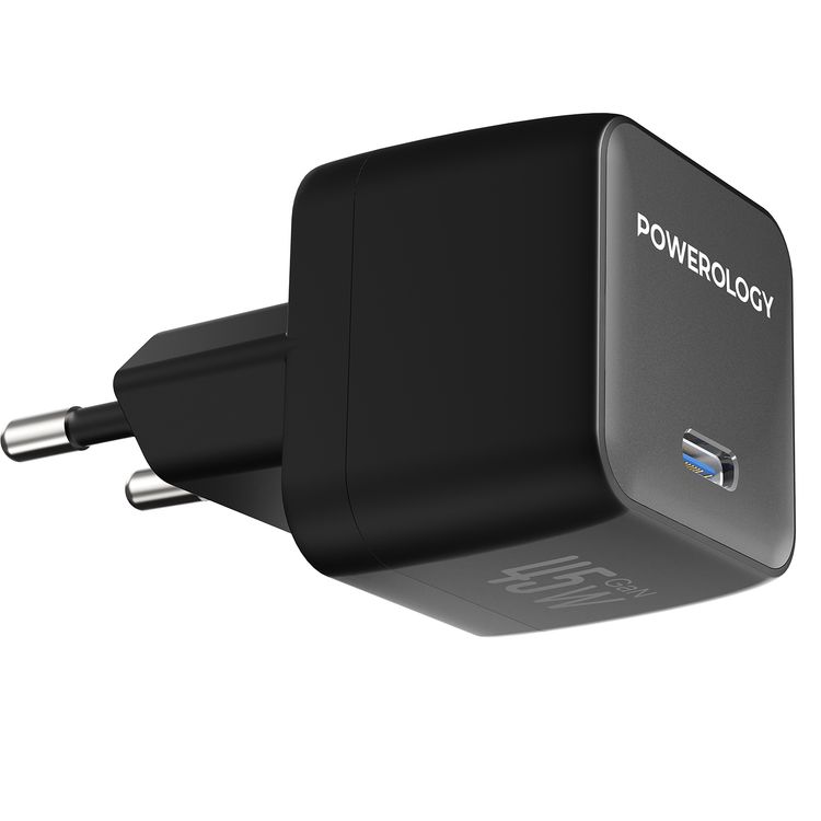 Powerology QX 45W Pocket-Sized GaN Adapter with Safety Protections, USB-C Port, Ultra-Compact Design, EU 2-Pin Plug, PD 45W - Black / Gray