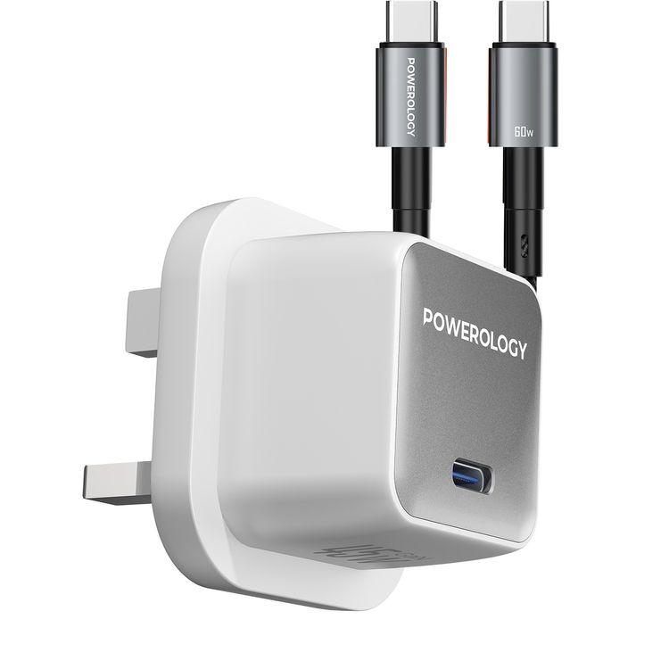 Powerology QX 45W Pocket-Sized GaN Adapter with Safety Protections, 1m USB-C to USB-C Cable Included, USB-C Port, Ultra-Compact Design, UK 3-Pin Plug, PD 45W - White / Silver