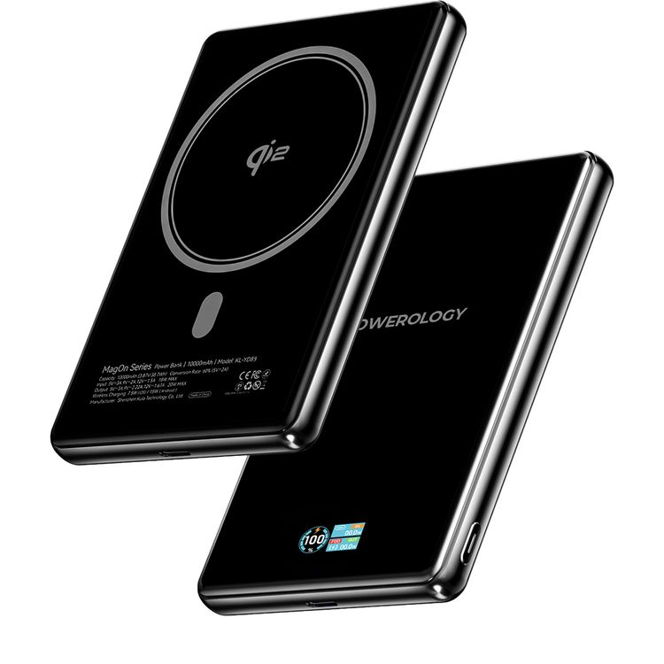 Powerology Skye 10000mAh MagSafe Power Bank with Smart Screen Display, 15W Wireless Charging, 20W Max Output Power, Qi2 Wireless Charging, Li-Polymer Battery, USB-C Input/Output Port, iPhone & Android Compatibility, Strong Magnetic Hold, Ultra-thin Design - Black