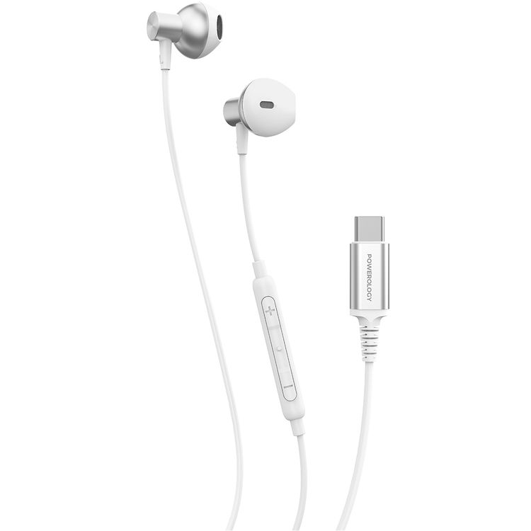 Powerology Stereo Earphones with Type-C Connection, HD Sound Quality, 5mW Max Power, 1.2m Cable Length, Button Control, Hi-Fi Audio, Crystal-Clear Audio, Lightweight & Comfortable Design - White