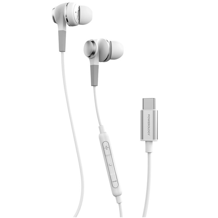 Powerology Stereo Earphones with Type-C Connection, HD Sound Quality, 5mW Power Max, 1.2m Cable Length, Button Control, Hi-Fi Audio, Crystal-Clear Audio, Lightweight & Comfortable Design - White