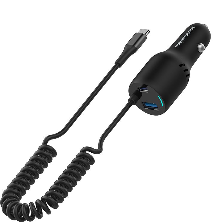 Powerology Triple Outputs Car Charger with Cooling Air Vent, 100W Power Delivery, Built-in Safeguards, Fast-Charging, Type-C & Type-A Outputs, Smartphones & Laptops Compatible - Black