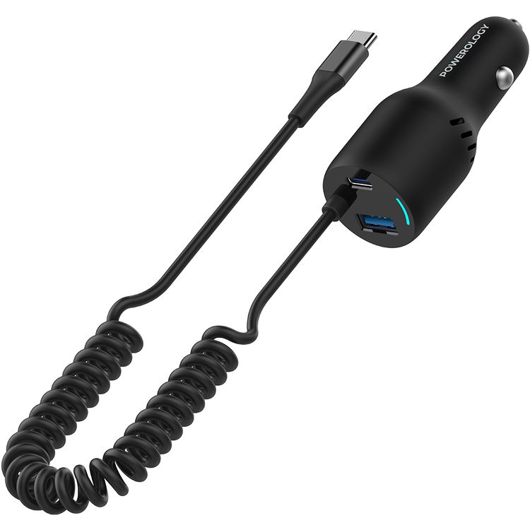 Powerology Triple Output Car Charger with 45W PD & 18W QC 3.0, Retractable Type-C Cable, Cooling Air Vent, ABS & PC Material, Built-in Safeguards, Fast Charging - Black