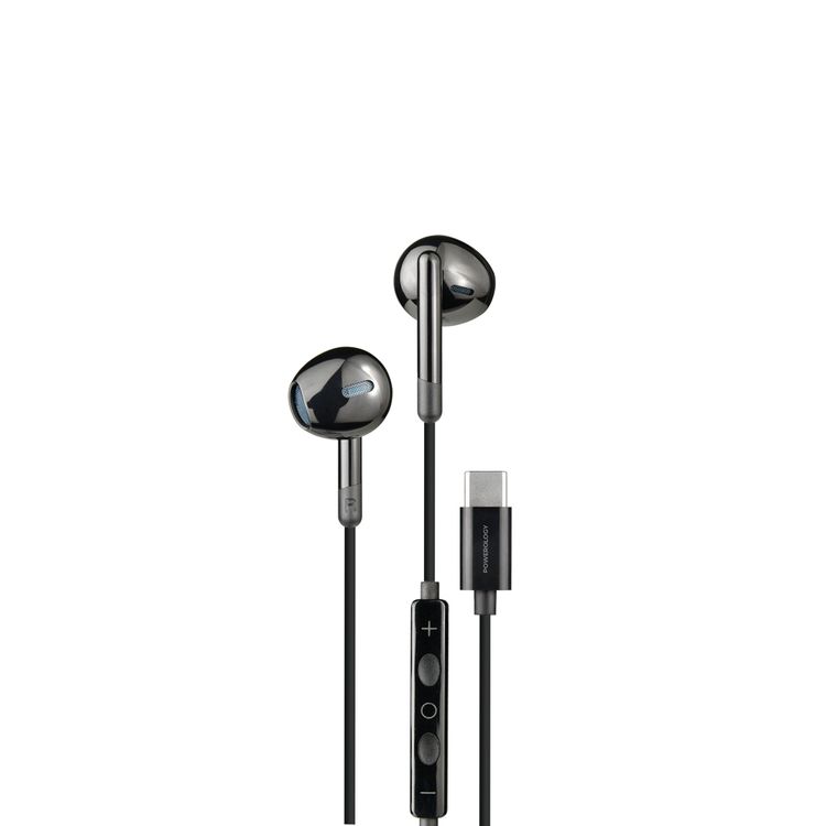 Powerology Type-C Stereo Earphones with HD Sound Quality, In-ear Design, 1.2m Cable Length, Voice Assistant Support, In-Line Control Button, Lightweight & Comfortable Design - Black