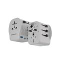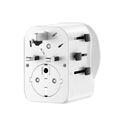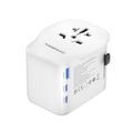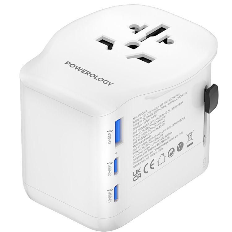 Powerology Universal Travel Adapter with PD 45W, USB-A & Dual USB-C Ports, US/ CN/ UK/ DE Plugs, Multiple Sockets, GaN Technology, Built-in Safeguards, +150 Countries Compatibility - White