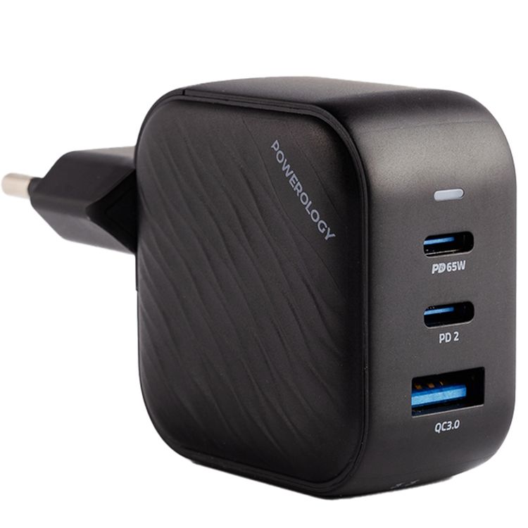 Powerology GaN Ultimate EU Dual PD Charger with 65W Power Delivery, 0%-60% Charge in 35 Minutes, 36W USB-A Output, Simultaneous Charging, Built-in Safeguards - Black