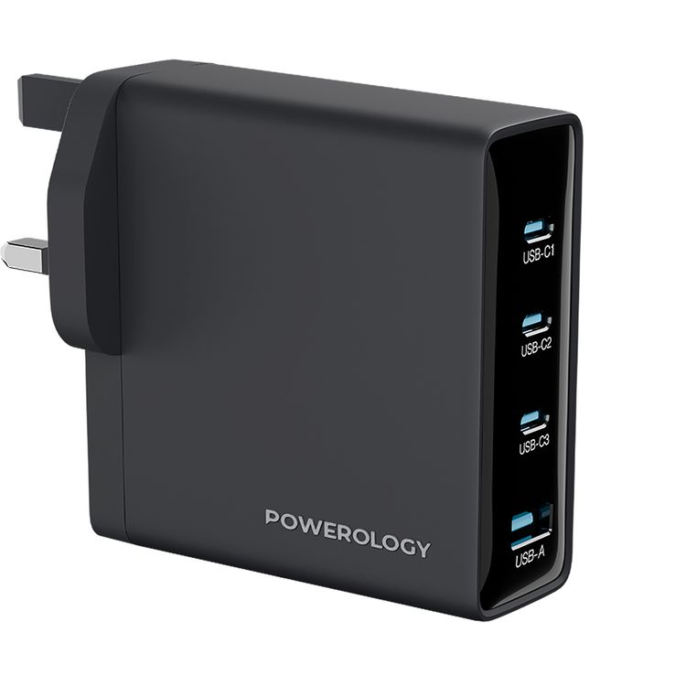 Powerology Volt-X 200W Multi-Port GaN Adapter with Heat Resistant Housing, Ultra-Fast Charging, Multi-Device Charging, QC 30W, 3 × USB-C Ports & 1 × USB-A Port, UK 3-Pin Plug - Black