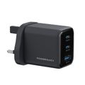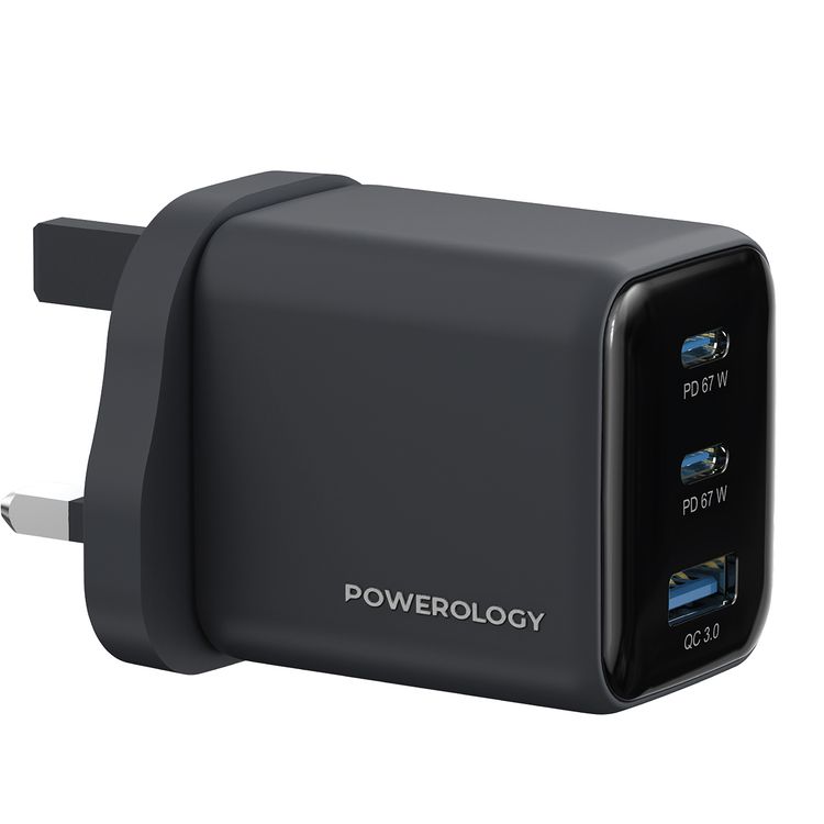 Powerology Volt-X 67W Multi-Port GaN Wall Charger with Advanced Safety Features, USB-A & Dual USB-C Ports, Compact Travel Size, Wide Compatibility, Fast Charging Speed, GaN Technology - Black