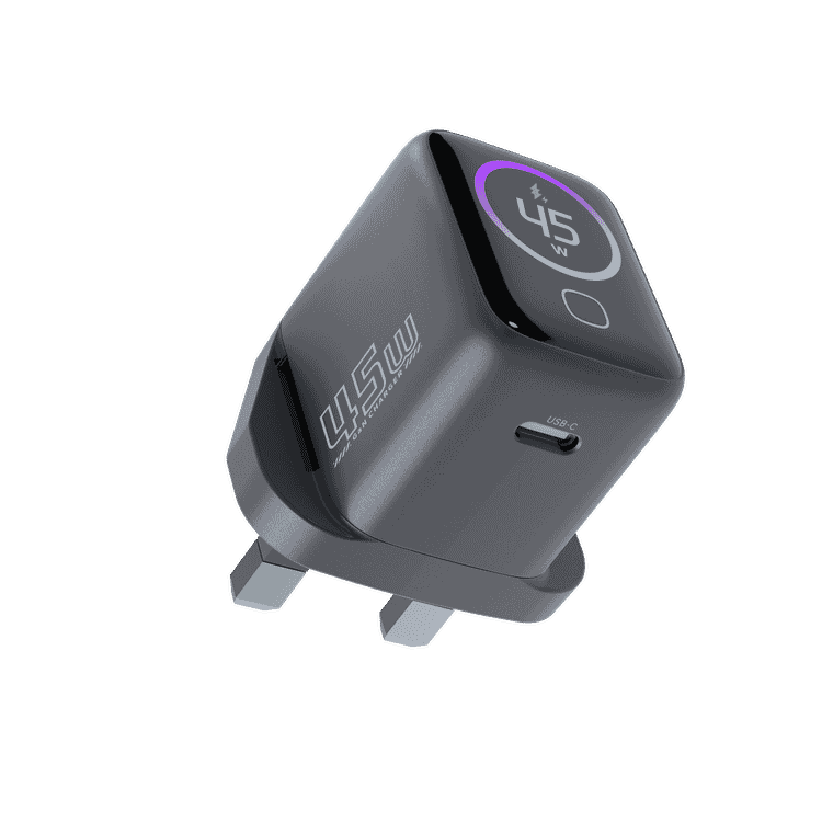 Powerology Voltflow 45W AVS GaN Wall Charger with 1m USB-C to USB-C Cable, 480Mbps Data Transfer Speed, 25°C to 50°C Operating Temperature, 110-240V Rated Voltage, Smart TFT Display, Rapid Power Delivery, PC Material - Gray
