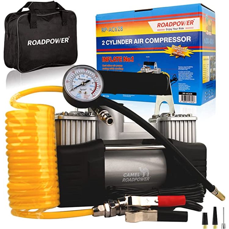 - The ROADPOWER Portable Double Cylinder Air Compressor Tire Inflator is a 12V compact air pump designed for inflating car tires, SUV tires, truck tires, bike tires, off-road tires, and trailer tires.